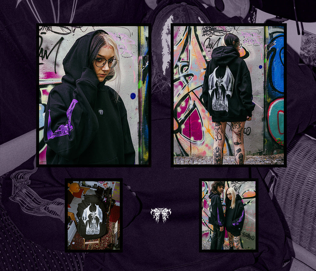 One of RAV. Heavyweight Hoodies featuring our huge Gargoyle backprint and vibrant purple sleeves!